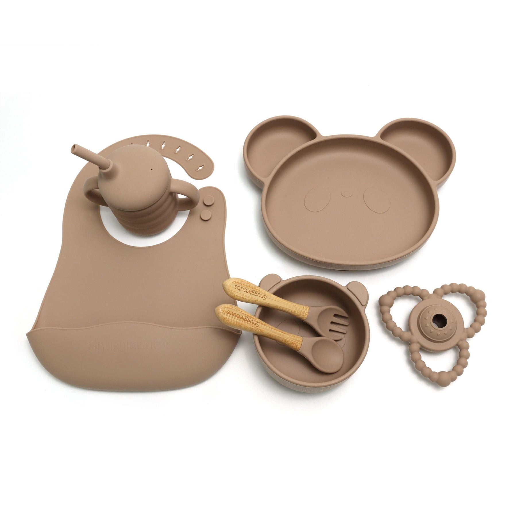 BROWN 7 PIECE SILICONE BABY AND TODDLER NON-SLIP SUCTION CUP FEEDING SET